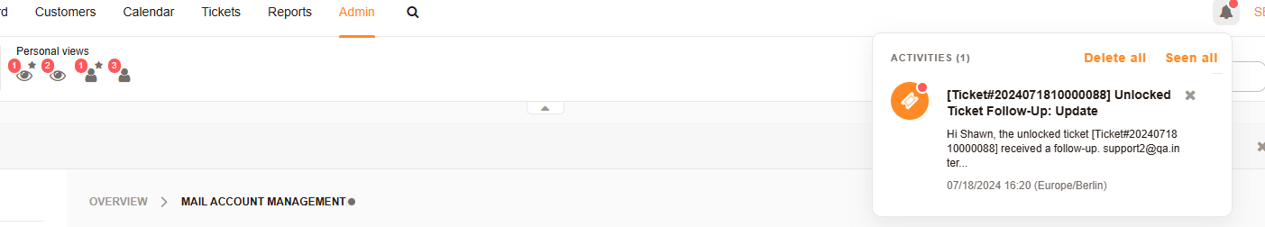 The watch feature, configured by your system administrator, enables active user ticket monitoring. Watch tickets are presented in their personal view. Users see when notes have arrived and reached pending times. Depending on the notification settings, watchers can also receive emails or activity notifications for watched tickets.