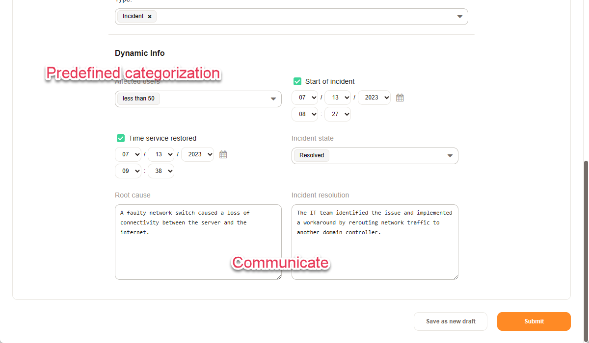 - Conduct a post-incident review to evaluate the incident management process and identify areas for improvement. After solving an issue, depending on it's impact, you can schedule a post-incident review for the team involved.
