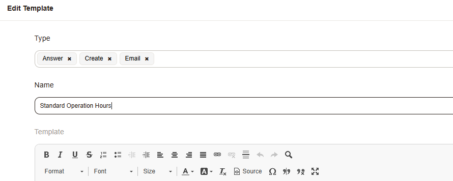• Create: Predefined text when creating a ticket per telephone call or proactively opening a ticket per email.